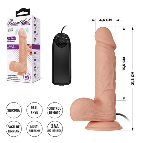Vibrador realista. ¡Perfecto para una satisfacción verdaderamente gigantesca! Vibrador de color piel con forma de pene realista. Tiene un glande abultado, venas en el eje y testículos lisos. Tiene modos de vibración placenteros, los cuales se pueden controlar fácilmente con el control remoto conectado. La ventosa adicional hace posible la diversión con las manos libres, además la ventosa se puede retirar!.